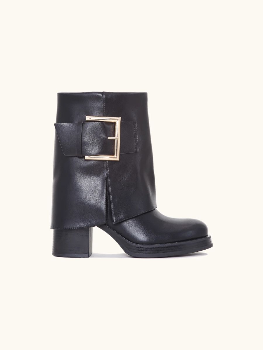 Black faux leather ankle boots with a statement gold buckle. Elegant and bold — perfect for adding edge to any outfit.