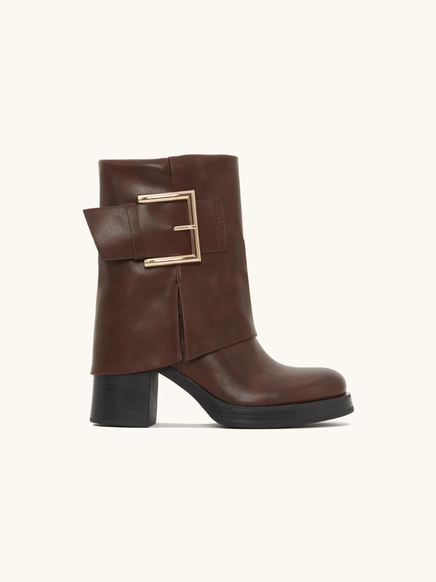 Brown ankle boots with an oversized gold buckle. Bold silhouette and modern design for a sophisticated look.