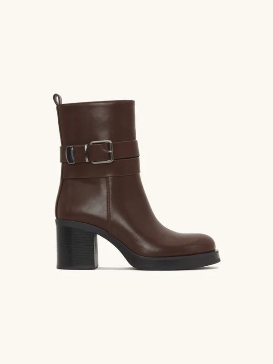 Elegant brown faux leather ankle boots with a silver buckle. Timeless style and confident allure for every season.