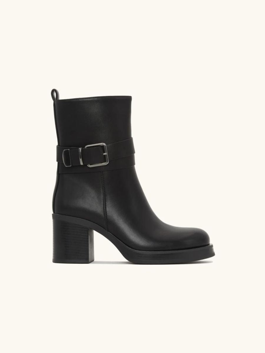 Classic black faux leather ankle boots with a sleek silver buckle. Comfort meets effortless chic.