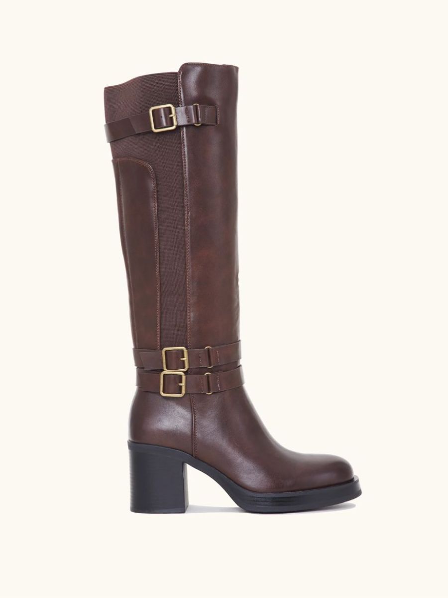 Brown riding boots with block heel and triple gold buckles, blending elegance and confidence. Perfect for autumn wear.