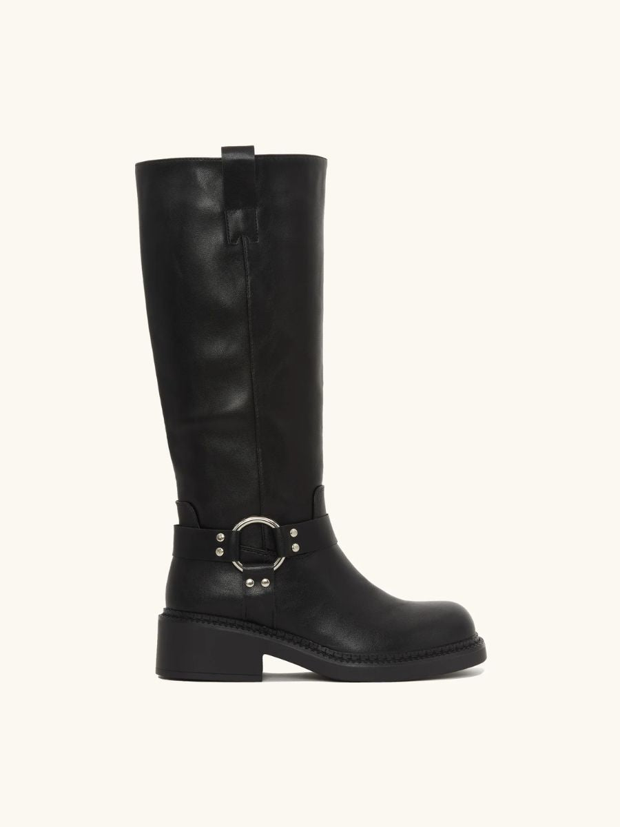 Black biker boots with silver ring detail, sturdy sole. Strength meets freedom in this iconic design.