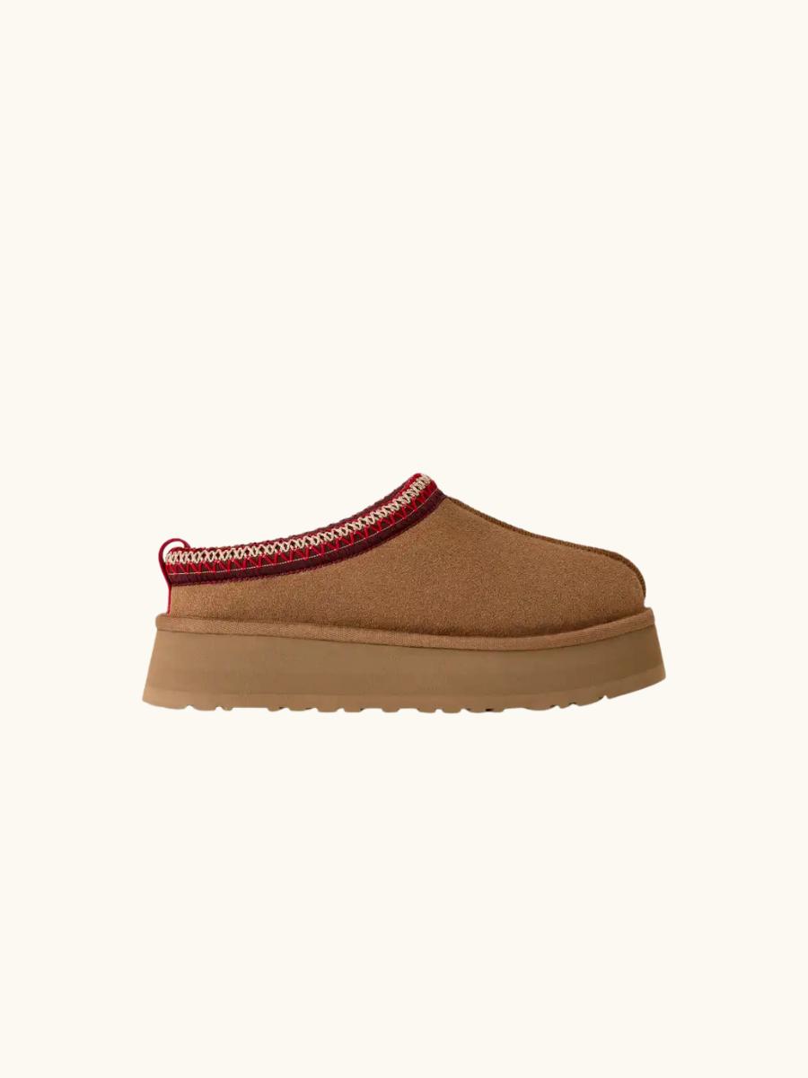 Camel suede winter mules with red braided trim and lightweight platform sole. Cozy comfort meets bold style for chilly days.