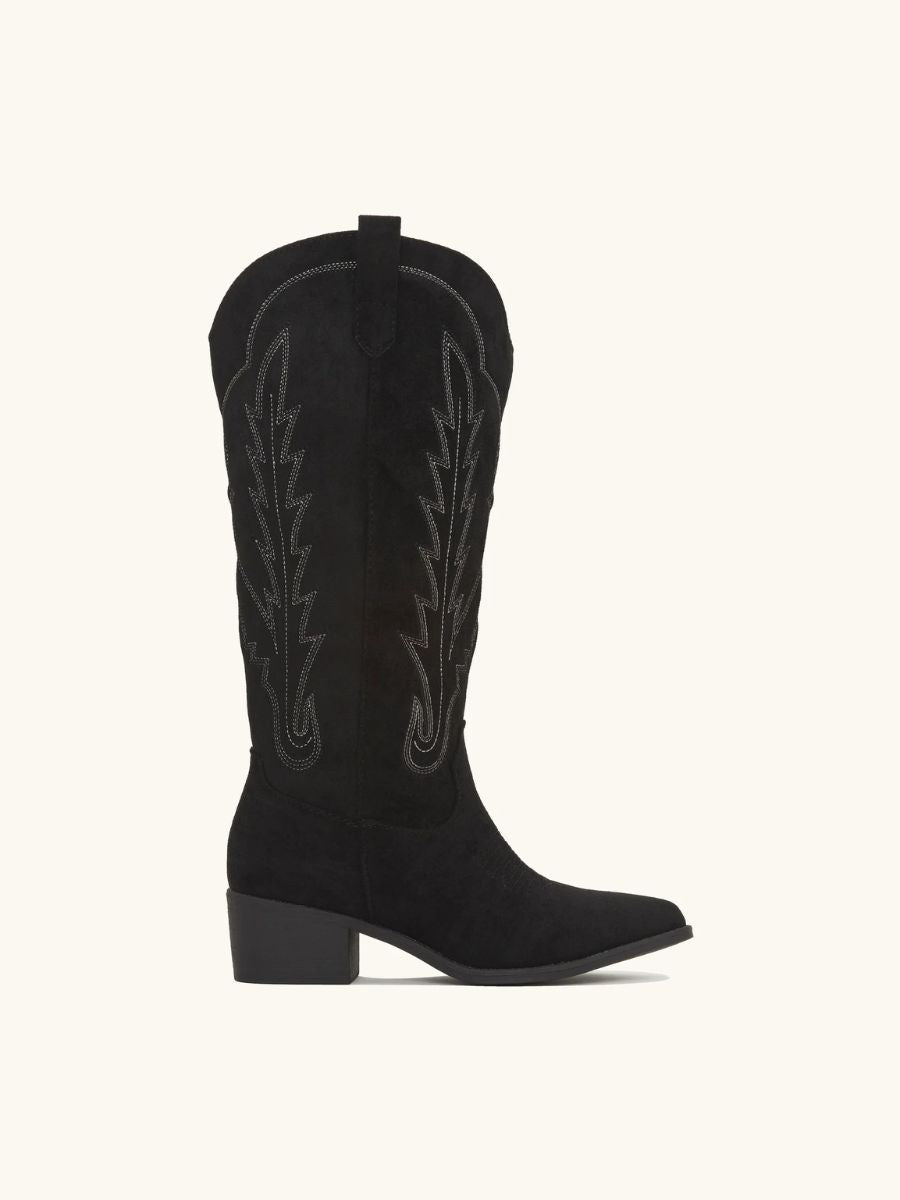 Black suede cowboy boots with classic western stitching. Bold, timeless elegance inspired by the Wild West.